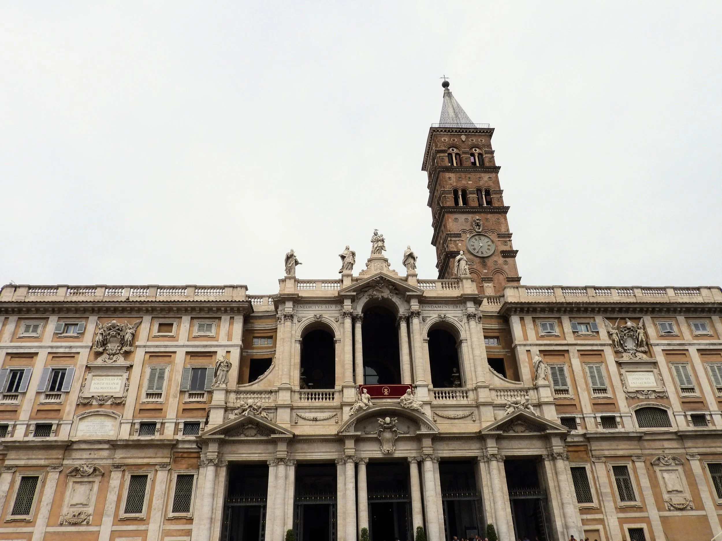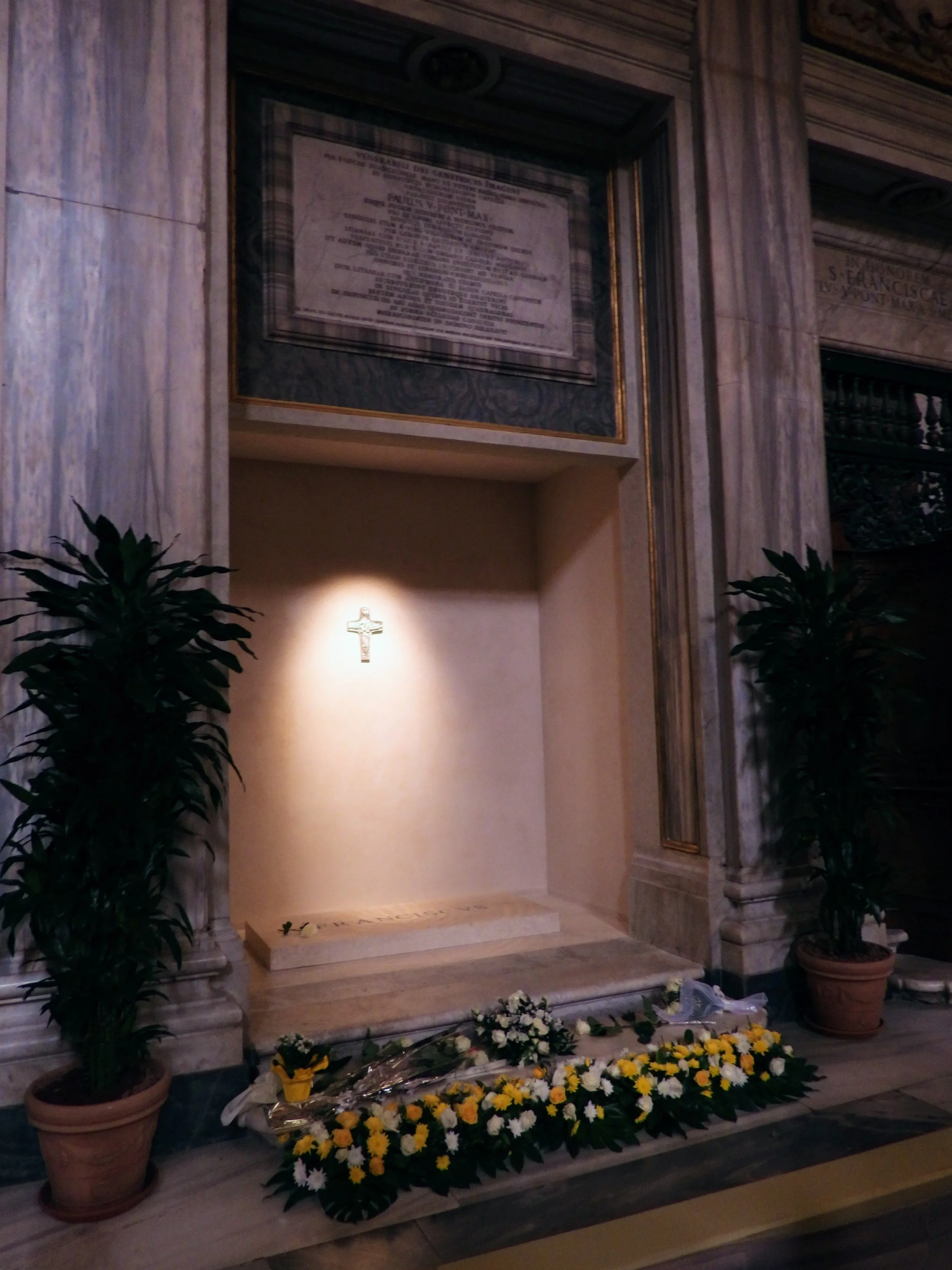 We kwamen via het park/plein Piazza Vittorio uit bij de ‘Basilica Papale Santa Maria Maggiore’ – hier is de laatste Paus vorige week begraven. Gezien de massale drukte vandaag op het St Pietersplein vanwege de toespraak van de nieuwe Paus besloten we dan maar een begraven Paus te gaan bezoeken en sloten aan in de lange rij. De drukte kwam waarschijnlijk mede door het tijdstip, het was half 12 en er begon ook een mis.