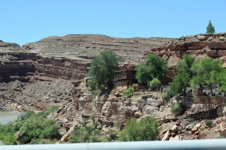 We zijn richting het motel gereden (nog 18 km dus) waar we 5 jaar geleden ook sliepen, de San Juan Inn. Een heel bijzondere plek! Het leek alsof er veel van de rotsen waar dit op gebouwd is afgebrokkeld zijn in die tijd en vooral het restaurant hangt er een beetje bij te bungelen boven de afgrond..lekker veilig gezicht!
