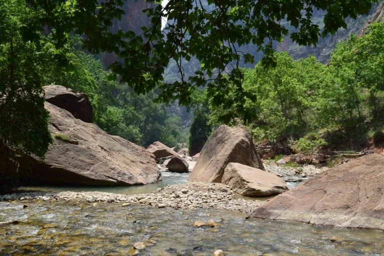 Jammer was dan wel dat wij ons niet zo goed hadden voorbereid als we dachten want aan het einde van het pad bleek dat je, voor je the Narrows in zou gaan, al water-waterbestendige schoenen had moeten hebben. Wij dachten dat je eerst door the Narrows zou komen en dan pas het water in zou moeten…. super balen want dat hadden we heel graag gedaan, tussen rotsen van 600 meter hoog die een paar meter van elkaar af staan doorlopen. Op blote voeten was geen optie, je moet het water door en gladde stenen over, door de rivier die tot boven je knieën komt dan en hard stroomt. Later zagen we ook dat je op een aantal plekken waterschoenen kon huren of kopen. Dus helaas, we zijn weer rustig terug gaan lopen met hier en daar een stop om al dat moois op een foto vangen..