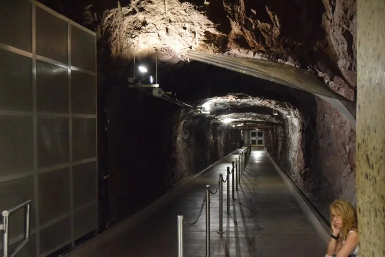 We moeten net als bij het vliegveld alle spullen in bakjes leggen zodat ze gescand kunnen worden en moeten ook zelf door een scanner lopen. Het is inmiddels 41 graden buiten. De tour bracht ons (na de gebruikelijke film met uitleg over het het bouwen van de dam) met een lift in heeeeeel weinig tijd naar 175 m diep (oren plopten dicht), we stopten eerst bij een water-inlaat.