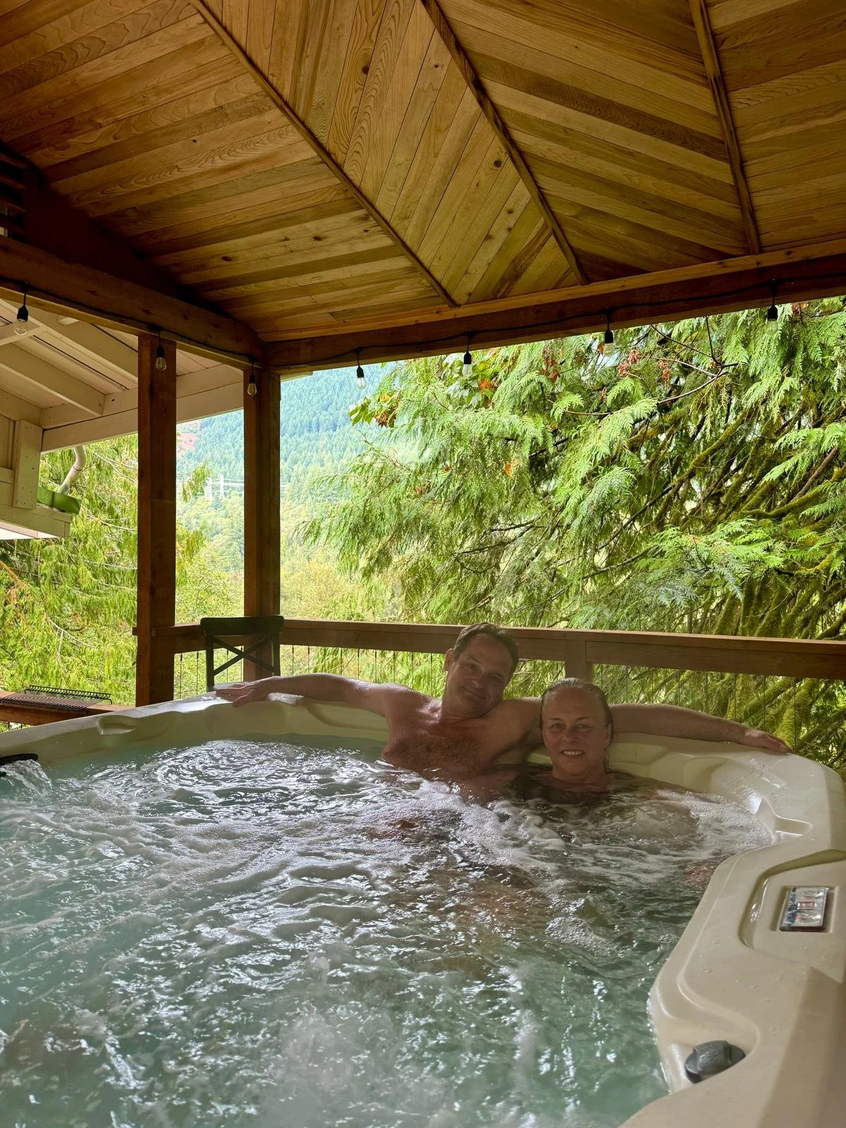 Tessa en Jacob zijn na het ontbijt naar huis gereden voor een nachtje, ze starten allebei aanstaande maandag met hun fulltime jobs en voor die tijd moeten er nog wat dingen geregeld worden. Bijvoorbeeld het overzetten van hun Colorado nummerplaat naar een Oregon nummerplaat, daarvoor moet de auto opnieuw geregistreerd worden met bijbehorende papierwinkel. Ook moeten ze een nieuw rijbewijs aanvragen want die moet geregistreerd staan in de staat waar je woont. Buiten dat zijn ze vorige week begonnen met danslessen en willen die vanavond liever niet overslaan😊 Dus Eddy en ik genieten nu ondanks het niet warme weer van o.a. buiten lezen en dit typen, je hebt het gevoel niks te willen missen van het tijdelijk in de bossen wonen! We kunnen straks altijd opwarmen in de jacuzzi en de open haard laten we lekker de hele dag aan. In de avond keken we wat er allemaal op tv te vinden is aan eindeloos veel kanalen, er zijn zelfs kanalen met alleen beelden van onweer of tropische eilanden mocht je echt je tv 24/7 aan willen hebben.