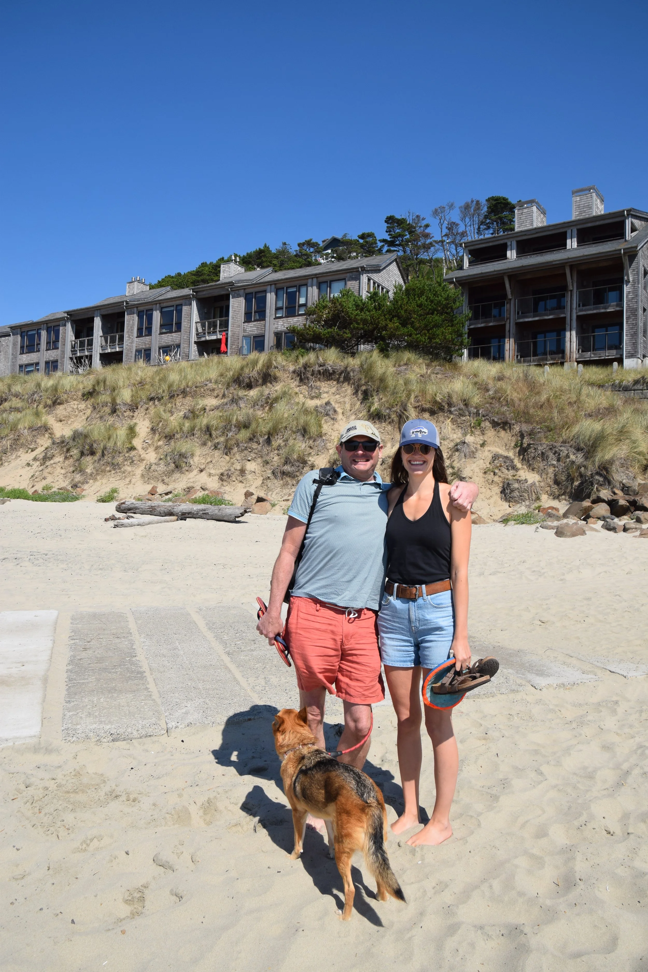 Vandaag zouden we richting Newport en Depoe Bay rijden, maar wat veel leuker is, we hebben met Tessa en Jacob afgesproken! Ze ontvluchten de hitte in het binnenland voor een nachtje en gaan kamperen aan de kust. We spraken af bij Pacific City, iets boven onze overnachtingsplek en iets onder de camping waar Tes en Jacob zullen slapen. Via allerlei wegen door bossen (hoe kan het ook anders) arriveerden we 2 uurtjes later aan het strand, zon en zee! Heerlijk. In het water ligt een van de 2 Haystack Rocks die de Oregon Coast rijk is, een monoliet van bijna 100 meter hoog met een mooie arch aan de zijkant. Het is prachtig weer met een bijna fris zeewindje. We hebben genietend van het uitzicht gewacht tot Tessa en Jacob met Fox arriveerden, zo zie je elkaar gewoon ergens langs de kust in Oregon😊Een groep meeuwen ontdekten bij de spullen van mensen die even wegwaren gegaan etenswaar en het duurde niet lang of ze hadden hun lunch te pakken! Een stoer meisje kwam aanlopen om ze weg te jagen maar ze waren niet echt onder de indruk.
