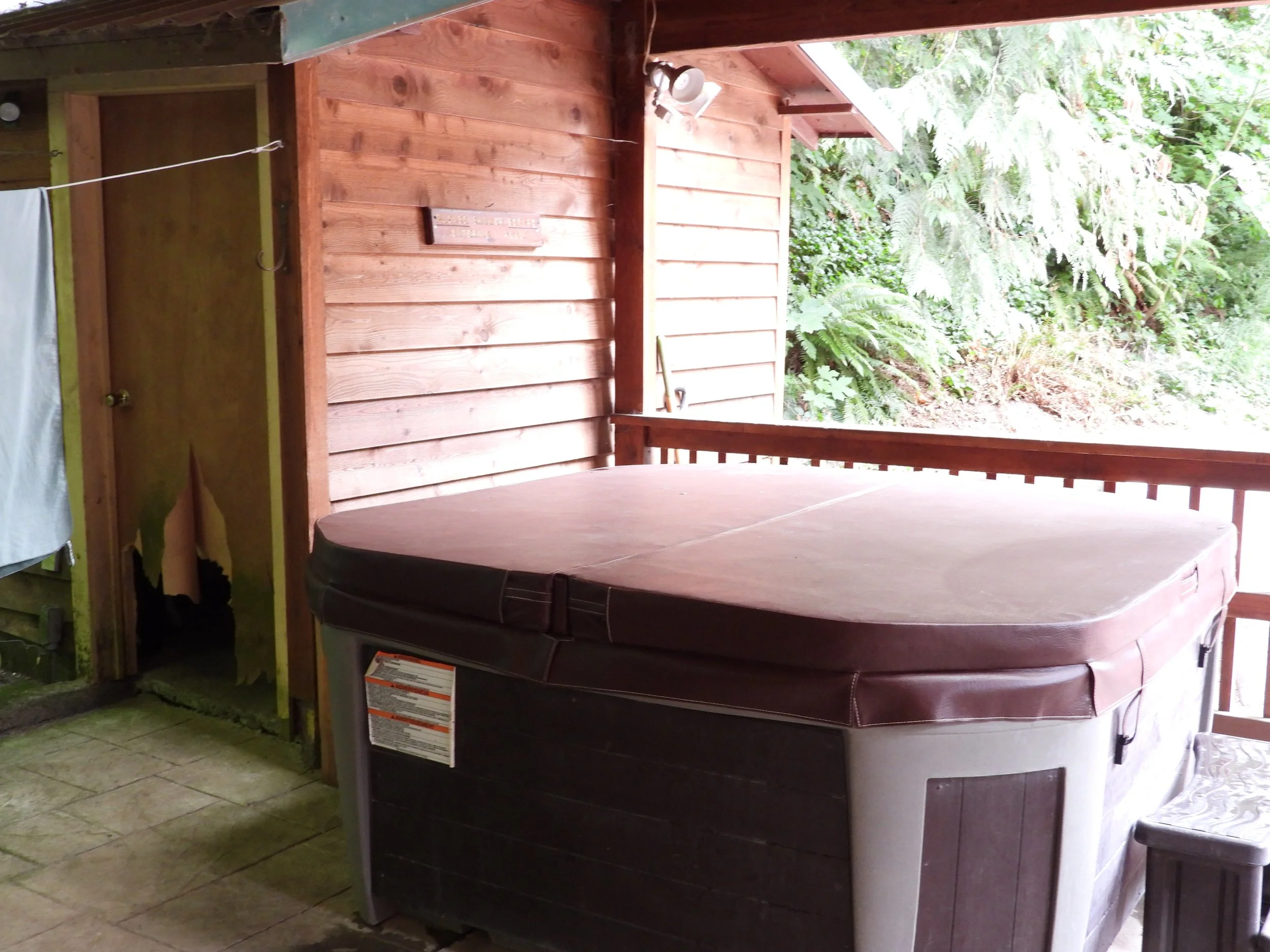 De volgende ochtend zagen we een groot gat in een schuurdeurtje naast de jacuzzi, hmmm vreemd. Toevallig kregen we iets later een bericht van de eigenaar en wisten we hoe dat gat er gekomen was! Ze geven er verder niet veel om want de prullenbakken hebben geen bearproof deksels dus tja. We hebben lekker bij de rivier gezeten, ontbeten en de jacuzzi getest (waar zoveel chemicaliën inzitten dat er bergen schuim ontstonden).