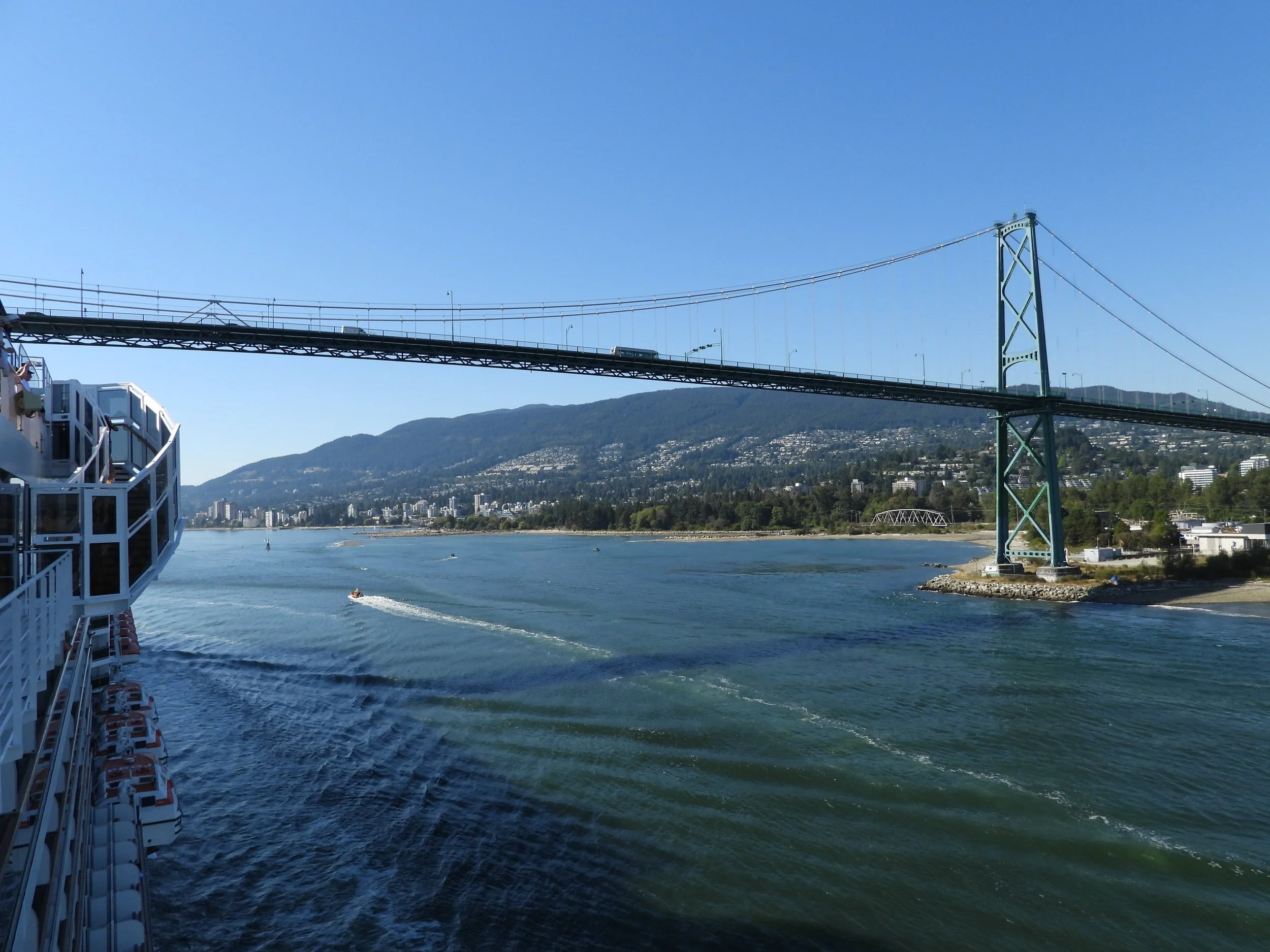 We hebben de verplichte veiligheidsfilm gekeken en hebben ons musterstation opgezocht waar je je moet melden in case of emergency. Even wat gegeten, het werd een pizzaatje als snel snackje. De rest van de middag hebben we doorgebracht buiten op het dek tot we om 16.00 uur vertrokken terwijl de Sail Away Party van start was gegaan met drankjes en muziek. Prachtig was het om op zo’n kolossaal schip langs Vancouver te varen met watervliegtuigjes overal om je heen, gejuich toen we onder de Lions Gate Bridge doorvoeren maar nog mooier werd het toen we langs de bergachtige kustlijn kwamen. Blowholes van walvissen waren er overal te zien en natuurlijk hadden we net de camera opgeborgen. Ik denk dat we op het dek toch altijd een tas bij ons moeten hebben met de verrekijker en camera!